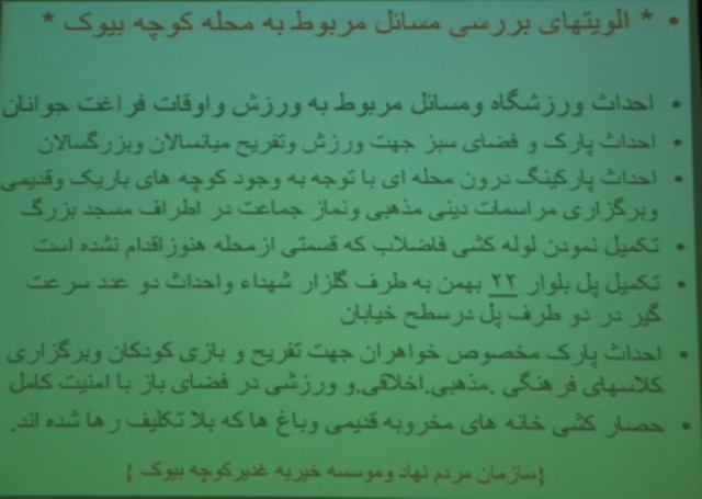 حجت الاسلام زارع رئیس شورای اسلامی شهر يزد که به همراه 2 تن دیگر از اعضا آقایان مدرسی و دکتر کاشفی زاده در این دیدار حضور داشتند با بررسی مشکلات ، در زمینه ایجاد پارک درون محله وفضای سبز، از ساکنین این محله خواستند در صورتی که مکانی مناسب برای ایجاد پارک و فضای سبز در محله وجود داشته باشد به شهرداری منطقه یک معرفي کنند تا شهرداری نسبت به تملک زمین و ایجاد فضای سبز اقدام نماید.