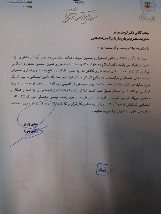 شورای اسلامی طی نامه ای به مدیران کل بهزیستی و تامین اجتماعی هفته بهزیستی و تامین اجتماعی را تبریک عرض نمود.