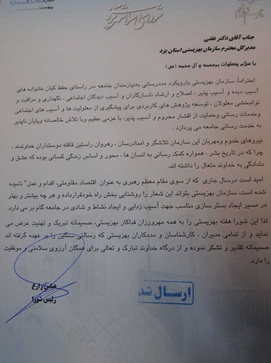 پیام تبریک شورای اسلامی شهر یزد به مناسبت هفته بهزیستی و تامین اجتماعی